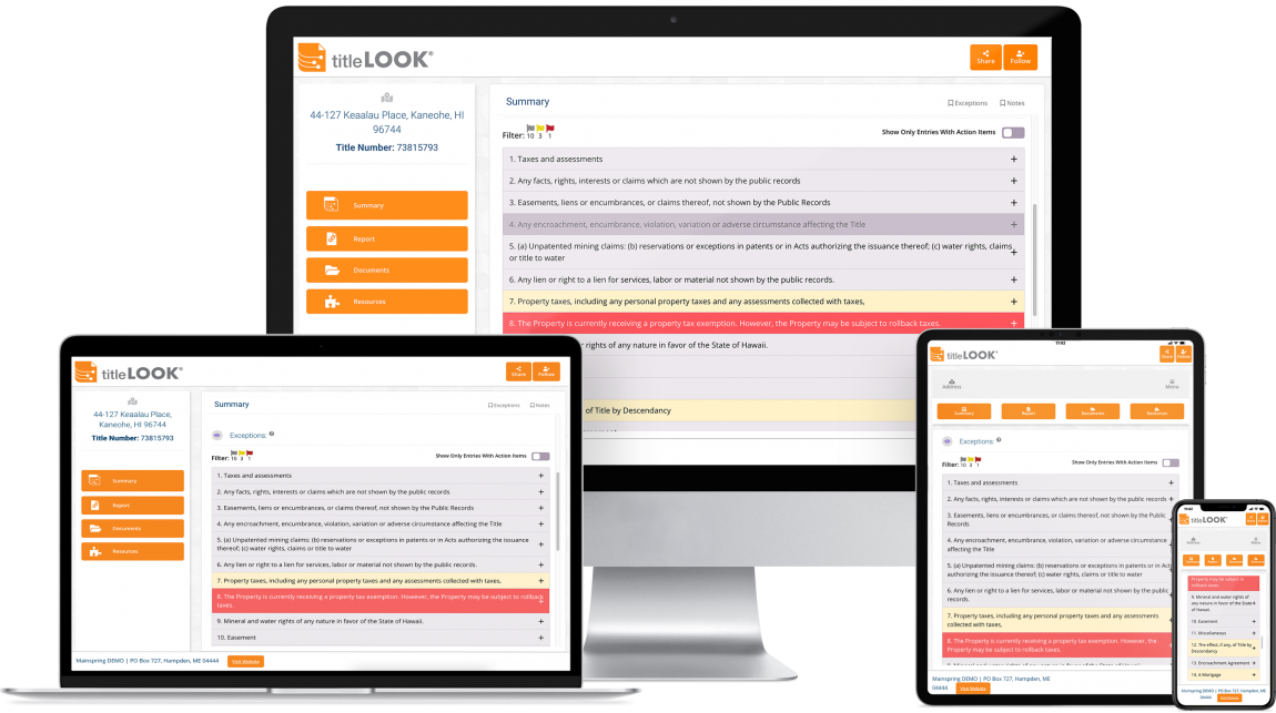 Title agents are not simply document and data gatherers. They are knowledge providers that identify defects, take curative action, and communicate clearance efforts. titleLOOK® automatically creates a unique website for each report, flags the critical exceptions and requirements, and provides an innovative "select & share" feature for delivering the agent's knowledge. The program also creates standardized MISMO®-compliant data for system-to-system exchange with other real estate professionals, such as settlement providers, lenders, real estate agents, and investors.