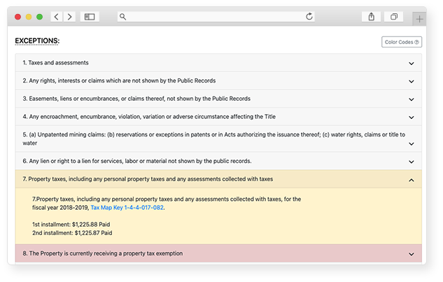 titleLOOK uses your own codebook or your underwriter’s codebook to create its exception report. This is your data, but digital. It’s displayed in a color-coded and intuitive way, and each section is expandable to allow the user to explore exceptions on demand, including further explanation and linked documents.