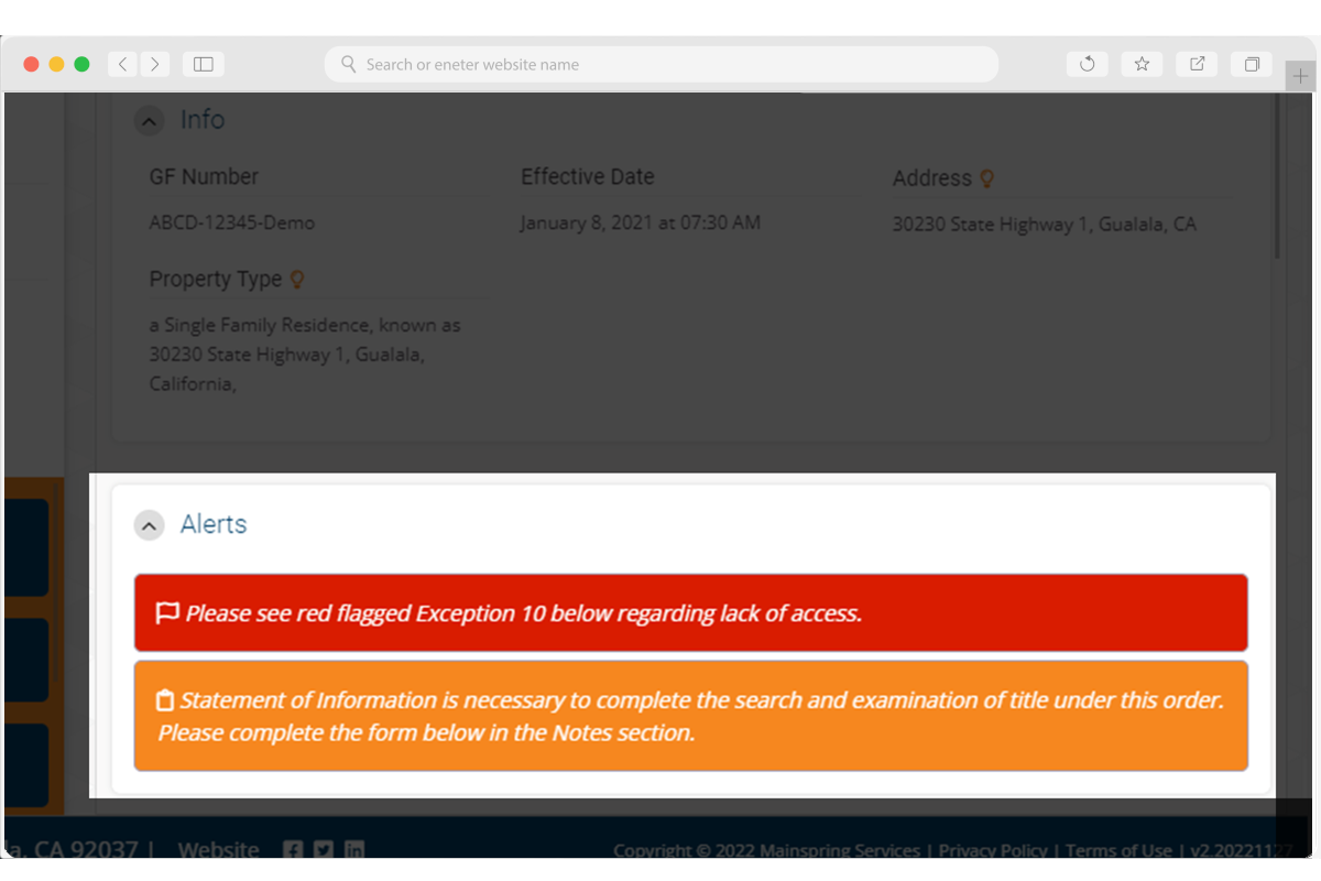 Why leave your most important takeaways buried in a PDF? By uploading only the documents you already produce, titleLOOK can identify alerts in multiple categories (Analysis, Audit or Action) and display them to your customers and your team. This feature is fully customizable, including where alerts display, the copy/messaging and the icon/color associated with each alert; we can even integrate your forms into alerts. Think: “If Exception X (or note, requirement, etc.) is included in this commitment, automatically include an Action Alert and attach Important Form B.” Alerts add tremendous value to your customers and employees, alike.