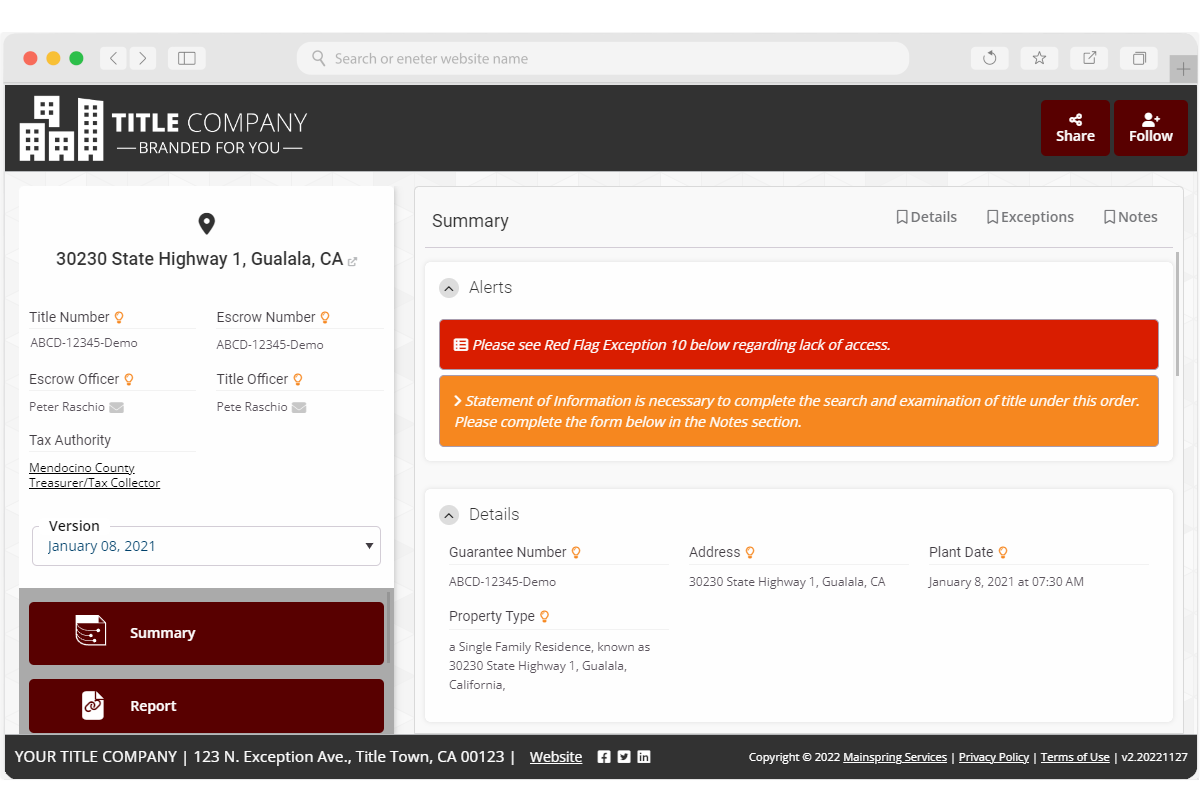 titleLOOK automatically extracts and displays summary information at the top of the page. Also prominent are the title officer’s name and a link to contact, a Google Maps link to the subject property, and the share and follow links.